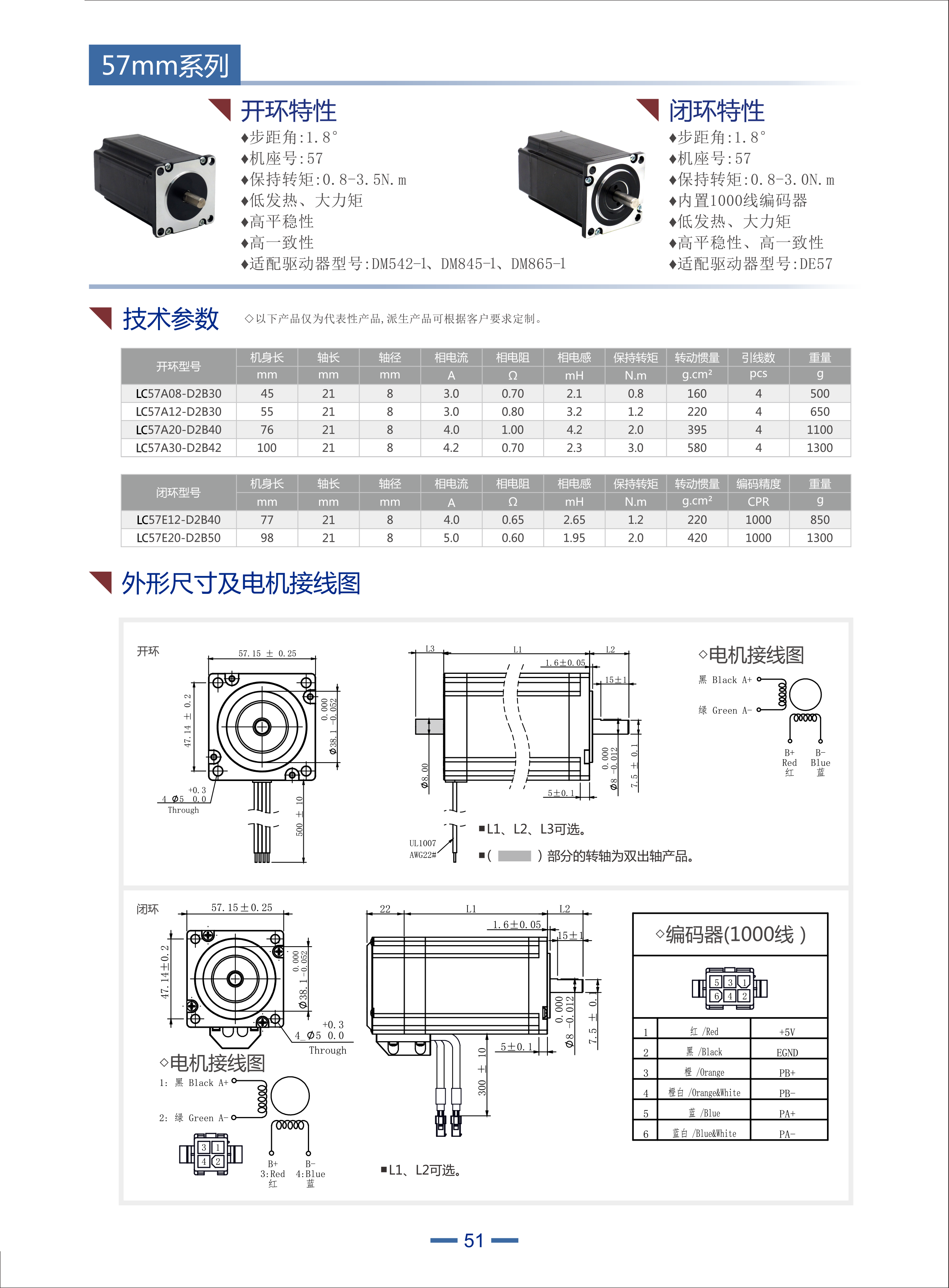 閉環(huán)特性 步距角:1.8° 機座號:57 保持轉矩:0.8-3.0N.m 內置1000線編碼器 低發(fā)熱、大力矩 高平穩(wěn)性、高一致性 適配驅動器型號:DE57 | 開環(huán)特性 步距角:1.8 機座號:57 保持轉矩:0.8-3.5N.m 低發(fā)熱、大力矩 高平穩(wěn)性 高一致性 適配驅動器型號:DM542-1、DM845-1、DM865-1 |