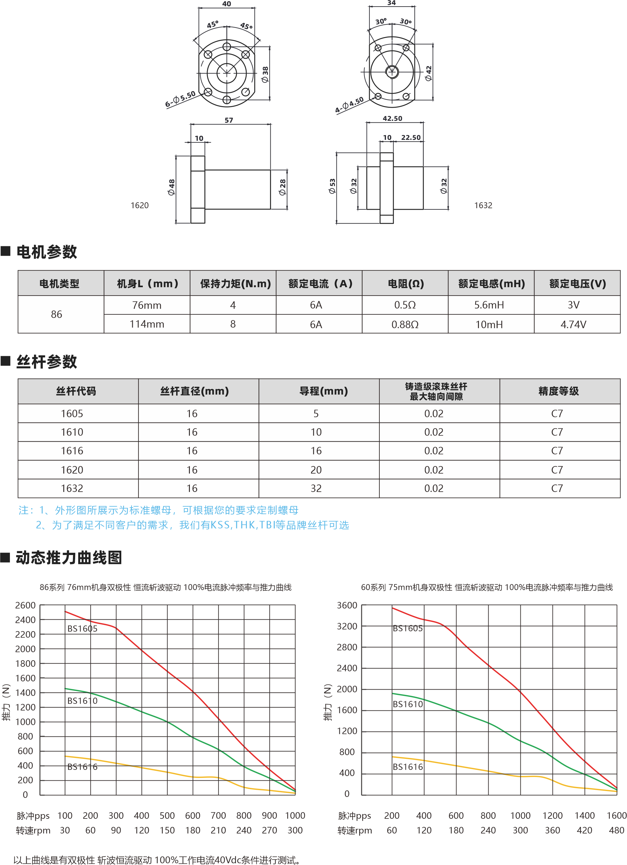 86系列滾珠絲桿電機(jī) 相數(shù) 步距角精度 IP等級(jí) 認(rèn)證 絕緣等級(jí) 運(yùn)行環(huán)境溫度 0 土5% 40 ROHS CE ISO9001 B( 130C) -20C- +50C 外形圖 69.6 4 J 5m ELo 02+005 螺母外形圖 60 配西 6 C0 50 1510 1621 1532 電機(jī)參數(shù) 電機(jī)類型 86 機(jī)身L(mm) 76mm 11 4mm 保持力矩(N.m) 額定電流(A] 64 64 電阻(Q] 0.50 0.880 額定電感(mH) 5.6mH 10mH 額定電壓IV) 3V 4.74V 絲桿參數(shù) 絲桿代碼 1605 1610 1616 1620 1632 絲桿直徑(mm) 16 16 16 分 16 導(dǎo)程(mm) 5 10 16 20 32 鑄適級(jí)滾珠絲桿最大軸向間陳 0.02 0.02 0邪伴毖2 0.02 0.02 精度等級(jí) C7 C7 C7 0 C7 注: 1、外形圖所展示為標(biāo)準(zhǔn)螺母,可根據(jù)您的要求定制螺母 2、為了滿足不同客戶的需求,我們有KSS,THK,TBI等品牌絲桿可選 動(dòng)態(tài)推力曲線圖 86系列 76mm機(jī)身雙極性 屆流新法這動(dòng) 100%電流練沖數(shù)平與推力曲錢 2600240022002000180016001400120070008006004000 (N)長料 351670 240 270 300 wtpps 100 200 300 400 500 600 700 800 900 1000 專電rpm 30  60  90 120 150 180 210 0系列 75mm機(jī)身雙極性 信在新被這動(dòng) 100%電流隊(duì)沖頻平與推力曲法 3600 320028002400200076007200800400O 脈沖pps轉(zhuǎn)迪rppm 851605 351610 351616 20060 400120 600 180 800 1000 1200 1400 240 300 360 420 1600480 以上曲線是有雙極性 斬波恒流驅(qū)動(dòng) 100%工作電流40Vd親件進(jìn)行測試
