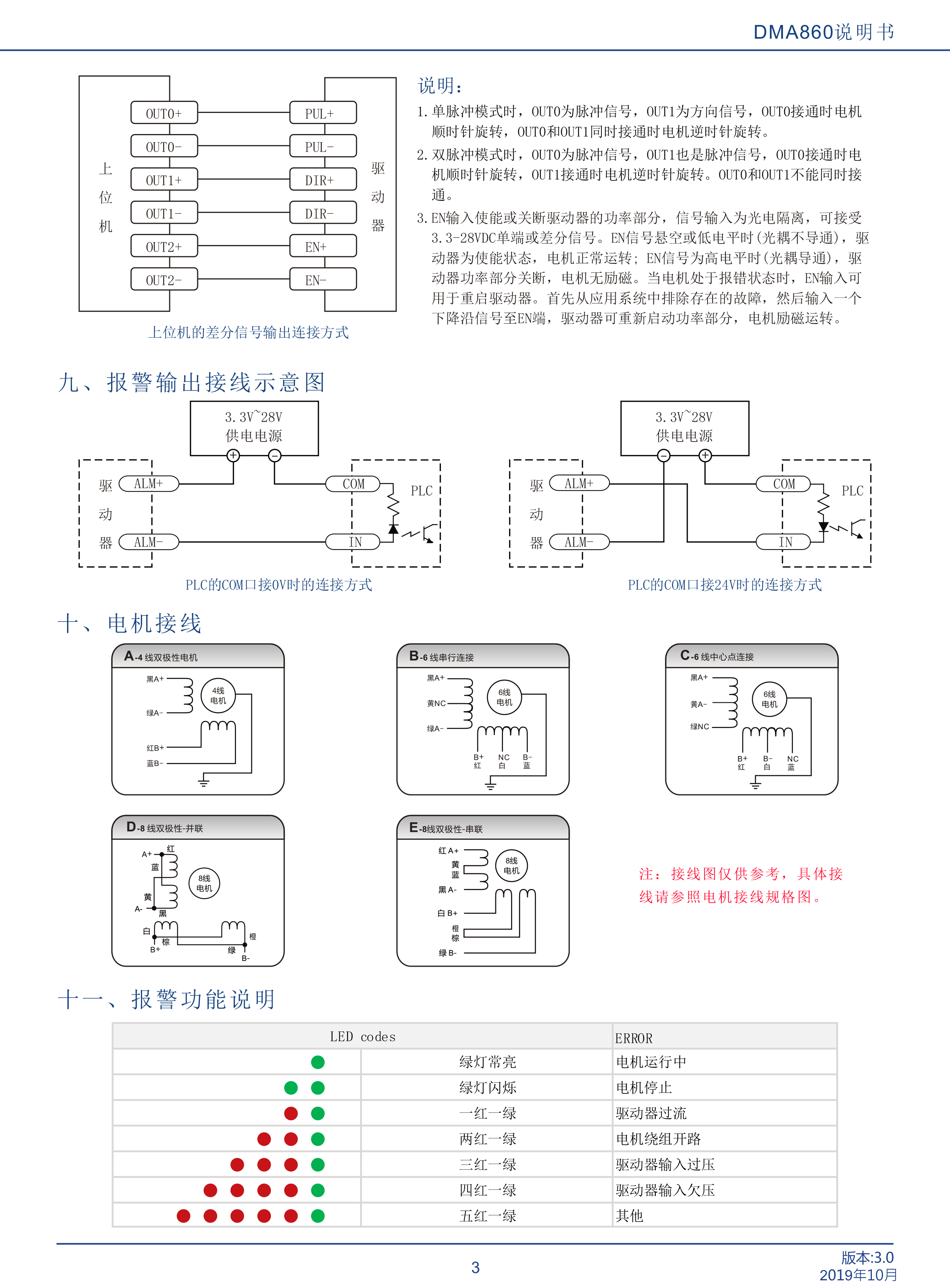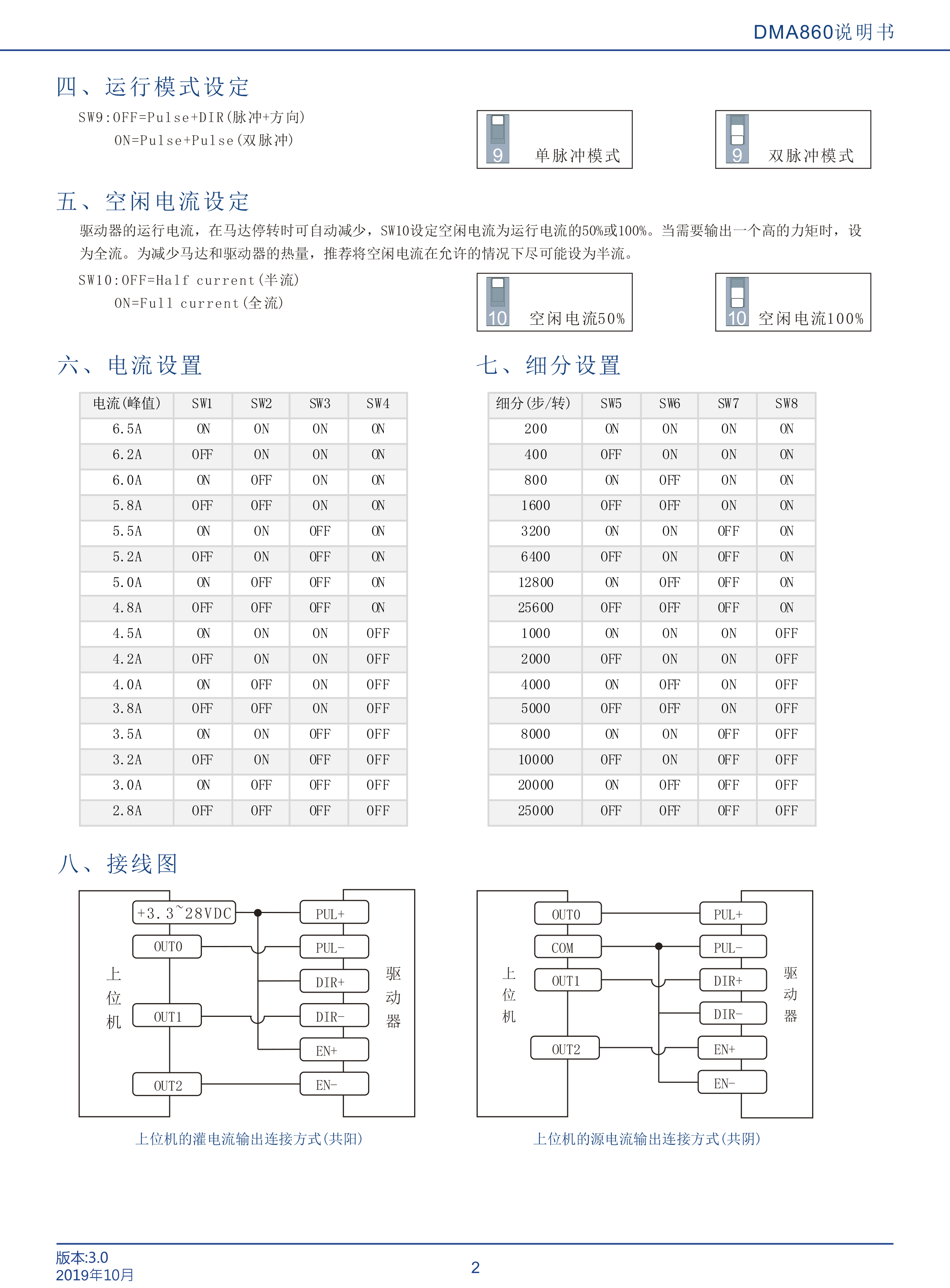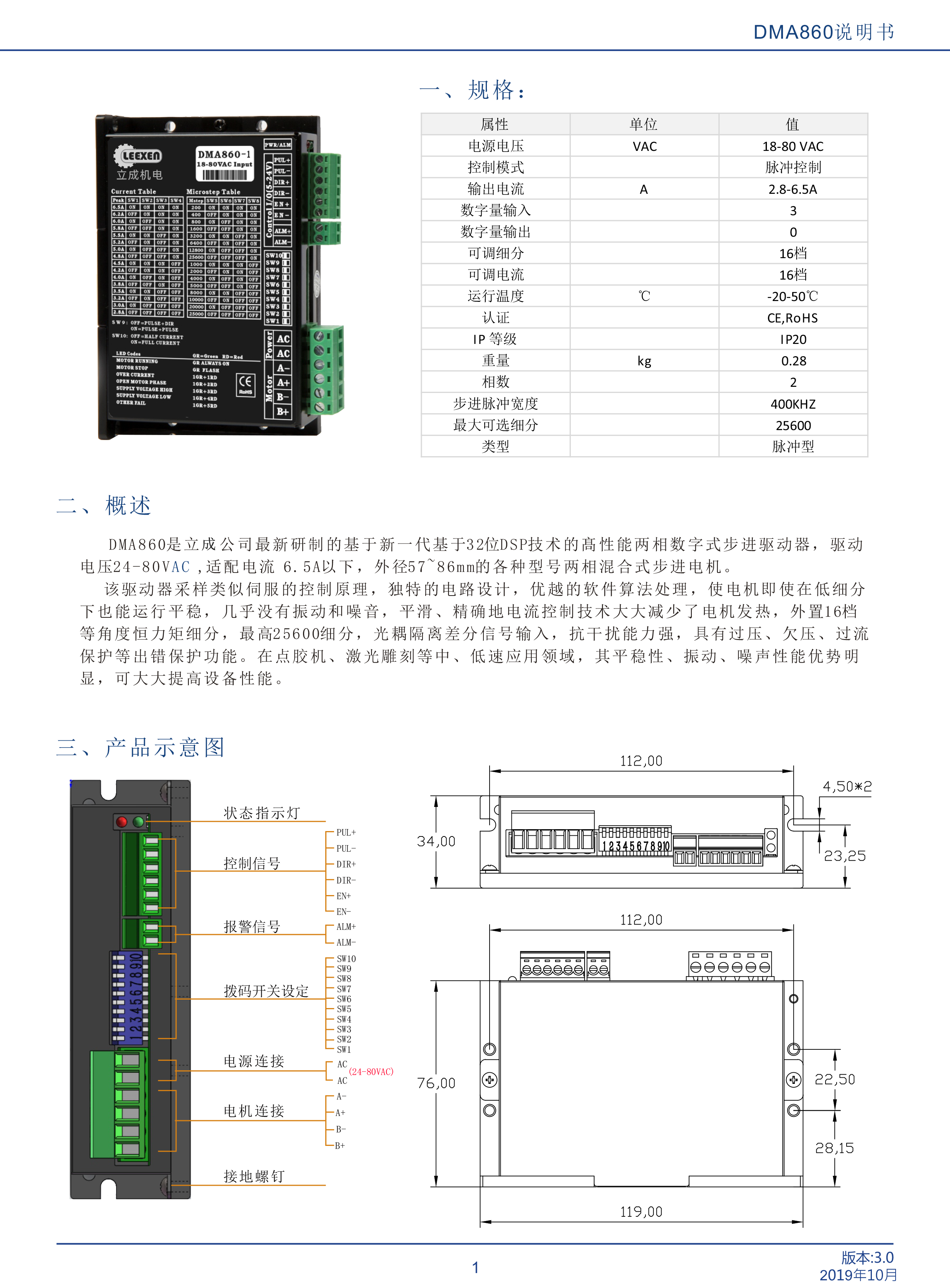 DMA860是立成公司最新研制的基于新一代基于32位DSP技術(shù)的高性能兩相數(shù)字式步進(jìn)驅(qū)動(dòng)器,驅(qū)動(dòng)電壓24-80VAC,適配電流 6.5A以下,外徑57~86mm的各種型號(hào)兩相混合式步進(jìn)電機(jī)。該驅(qū)動(dòng)器采樣類似伺服的控制原理,獨(dú)特的電路設(shè)計(jì),優(yōu)越的軟件算法處理,使電機(jī)即使在低細(xì)分下也能運(yùn)行平穩(wěn),幾乎沒有振動(dòng)和噪音,平滑、精確地電流控制技術(shù)大大減少了電機(jī)發(fā)熱,外置16檔等角度恒力矩細(xì)分,最高25600細(xì)分,光耦隔離差分信號(hào)輸入,抗于擾能力強(qiáng),具有過壓、欠壓、過流保護(hù)等出錯(cuò)保護(hù)功能。在點(diǎn)膠機(jī)、激光雕刻等中、低速應(yīng)用領(lǐng)域,其平穩(wěn)性、振動(dòng)、噪聲性能優(yōu)勢明顯,可大大提高設(shè)備性能。