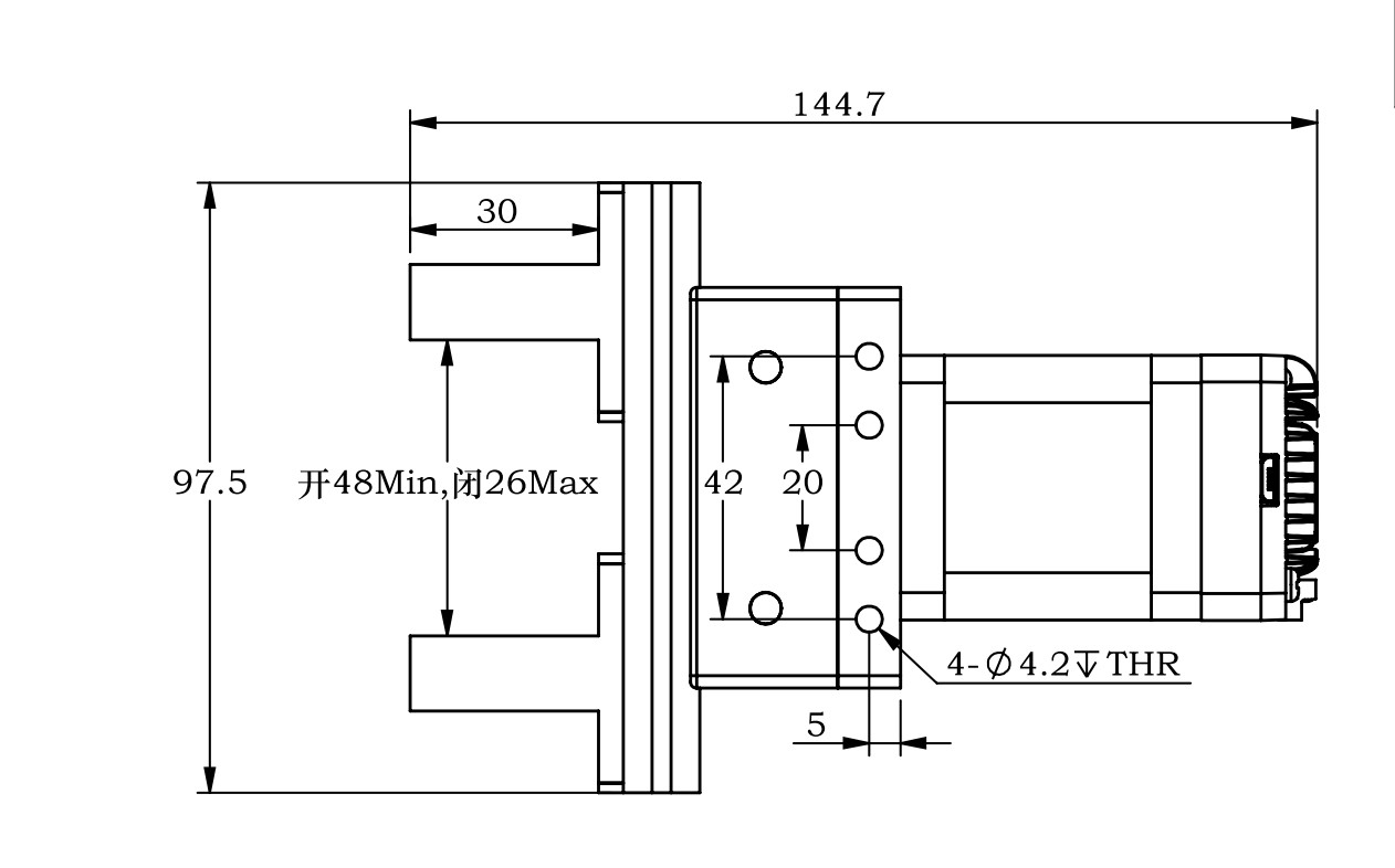 ## 集成一體化優(yōu)勢(shì)盡顯 傳統(tǒng)分體夾爪由多個(gè)獨(dú)立部件組成,如驅(qū)動(dòng)器、電機(jī)、控制器等,各部件之間需要繁瑣的布線和安裝調(diào)試,不僅占用大量空間,還增加了故障風(fēng)險(xiǎn)和維護(hù)成本。集成式步進(jìn)伺服電動(dòng)夾爪則將這些功能高度集成于一體,體積小巧緊湊。從資料中的尺寸數(shù)據(jù)可知,其整體結(jié)構(gòu)精致,僅重約0.2Kg,能夠輕松安裝在各種自動(dòng)化設(shè)備上,節(jié)省了寶貴的安裝空間,減少了設(shè)備整體體積,為生產(chǎn)線的布局優(yōu)化提供了便利。這種集成一體化設(shè)計(jì)大大簡(jiǎn)化了系統(tǒng)架構(gòu),減少了部件之間的連接環(huán)節(jié),降低了因連接松動(dòng)等問(wèn)題導(dǎo)致的故障概率,提高了系統(tǒng)的穩(wěn)定性和可靠性,使得設(shè)備運(yùn)行更加穩(wěn)定高效,有效減少了維護(hù)工作量和停機(jī)時(shí)間。 ## 精準(zhǔn)位置控制與快速響應(yīng),遠(yuǎn)超傳統(tǒng) 傳統(tǒng)分體夾爪在位置控制精度上往往難以滿足高精度生產(chǎn)需求,其定位誤差較大,容易導(dǎo)致抓取位置不準(zhǔn)確,影響產(chǎn)品質(zhì)量。而集成式步進(jìn)伺服電動(dòng)夾爪配備了1000線(4000 Counts)編碼器反饋系統(tǒng),能夠?qū)崿F(xiàn)極其精準(zhǔn)的位置控制。每旋轉(zhuǎn)一圈,編碼器可產(chǎn)生4000個(gè)計(jì)數(shù),通過(guò)精確的反饋機(jī)制,設(shè)備能夠?qū)崟r(shí)監(jiān)測(cè)夾爪的位置,并根據(jù)預(yù)設(shè)指令進(jìn)行精準(zhǔn)調(diào)整,定位精度極高。在抓取微小零部件時(shí),能夠準(zhǔn)確無(wú)誤地完成操作,有效避免了因位置偏差導(dǎo)致的抓取失誤。